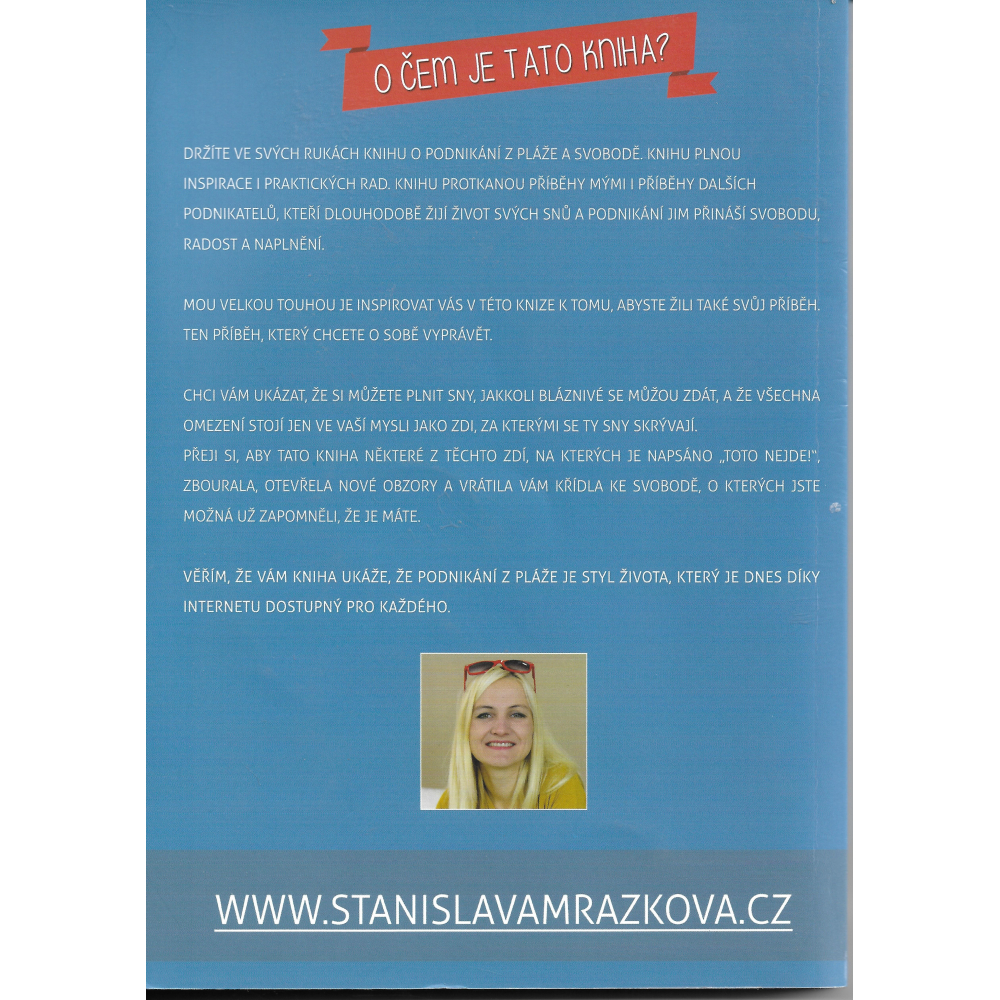 Žít život, ze kterého si nemusíte brát dovolenou. Život, ve kterém máte svobodu žít svobodně, radostně a naplno a mít za zády automatizovaný systém prodeje, který dnem i nocí pracuje pro vás, zatímco vy si toho života užíváte. Tak o tom je kniha Podnikání z pláže. V první části se seznámíte s osobním příběhem autorky Stanislavy Mrázkové a o její cestě z vystresované zadlužené matky s krachujícím manželstvím a stavební firmou až k úspěšné podnikatelce z pláže. Další části knihy se pak zaměřují na konkrétní oblasti života podnikatele, který své podnikání přepl na automatizovaný systém a ukazují, jak i v českém prostředí jde tímto způsobem úspěšně a efektivně podnikat. Na příkladech ze života autorky i dalších příběhů lidí, nám tato kniha velmi inspirativním způsobem ukazuje, jak změnit svůj život, plnit si své sny, jakkoli bláznivé se můžou zdát, a poukazuje na to, že všechna omezení stojí jen v naší mysli. Kniha otevírá nové obzory a možnosti podnikání pomocí chytrých nástrojů internetu a zároveň nakopává k tomu, abyste se vydali vstříc svým snům. Za první rok od vydání knihu četlo už přes 10 tisíc čtenářů.