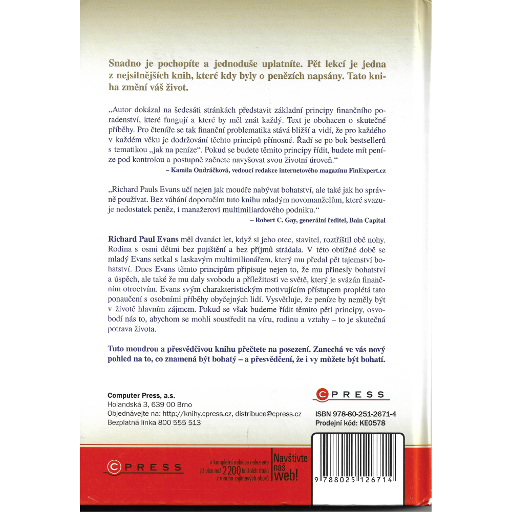 Pomocí pěti základních finančních principů vede autor čtenáře k tomu, aby dokázali zvýšit svou životní úroveň, dosáhnout finančního zdraví a třeba i finanční nezávislosti. Text je obohacen o skutečné příběhy. Pro čtenáře se tak finanční problematika stává bližší a vidí, že pro každého v každém věku je dodržování těchto principů přínosné. Pět lekcí lze snadno pochopit a jednoduše uplatnit Pomocí pěti základních finančních principů vede autor čtenáře k tomu, aby dokázali zvýšit svou životní úroveň, dosáhnout finančního zdraví a třeba i finanční nezávislosti. Text je obohacen o skutečné příběhy. Pro čtenáře se tak finanční problematika stává bližší a vidí, že pro každého v každém věku je dodržování těchto principů přínosné.