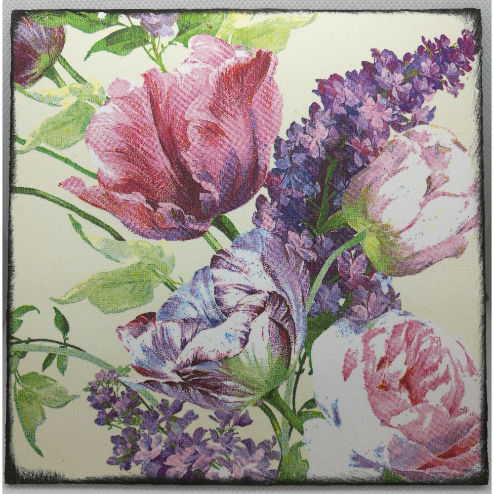 Decoupage obrázky na sololitové destičce 16x16 cm s háčkem na pověšení.