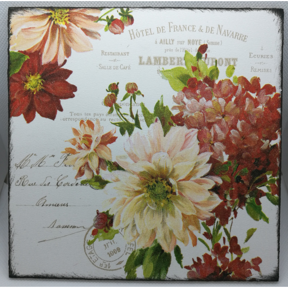 Decoupage obrázky na sololitové destičce 16x16 cm s háčkem na pověšení.