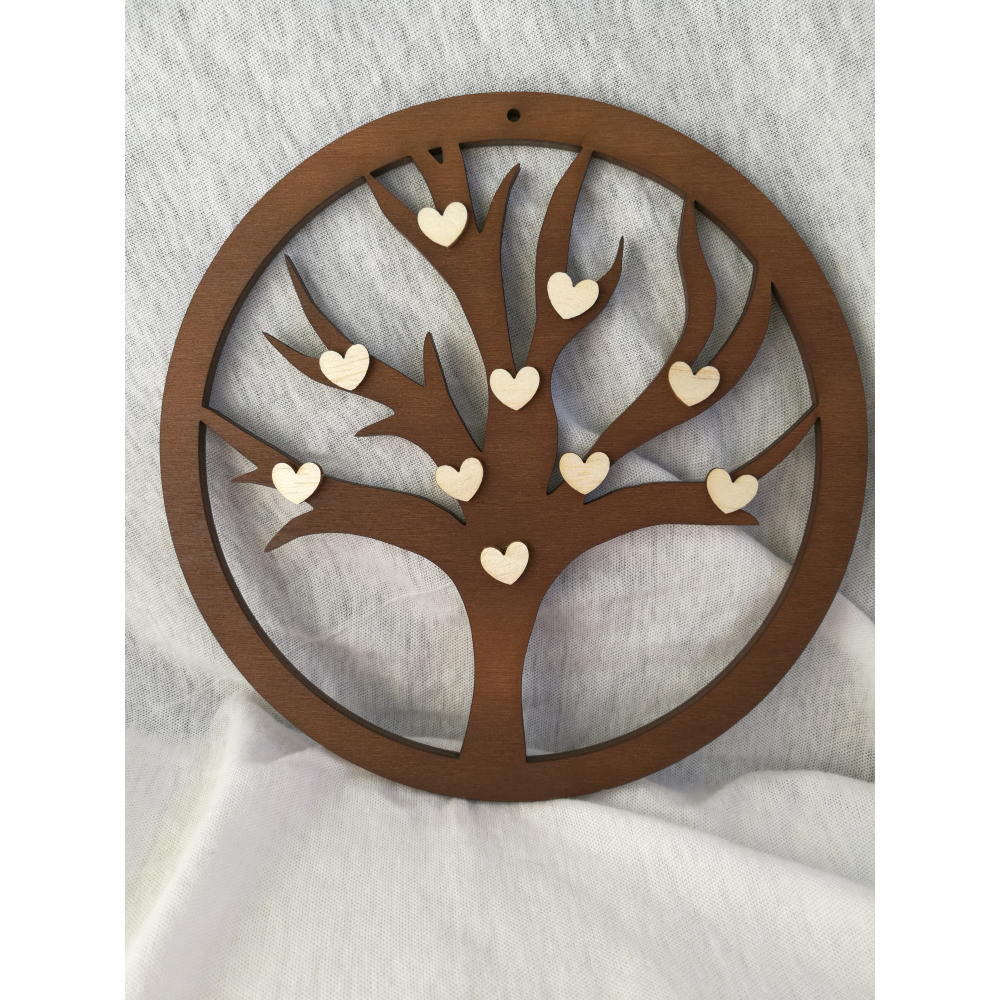 Dřevěný strom života na zavěšení se srdíčky Průměr dekorace: 18 cm x 0,5 cm tloušťka Materiál: buk Vyrobeno v ČR