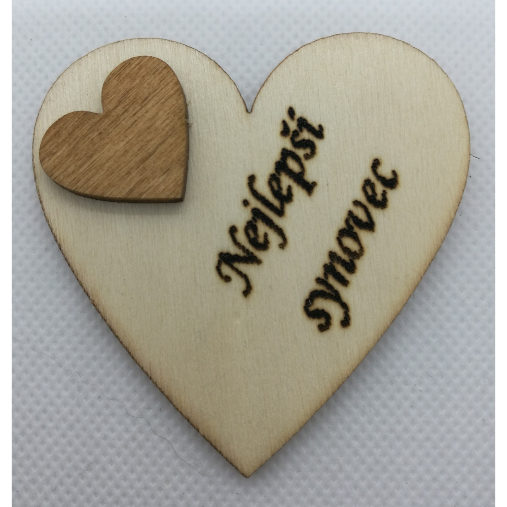 Srdce s věnováním z dřevěné překližky, 6x6 cm, vzadu s magnetem, dozdobeno srdcem širokém 2 cm. Text gravírován laserem. Umístění textu se může velmi mírně lišit, poloha srdce je nastavována ručně. Pokud není skladem, je možno do tří dnů vyrobit. Pro vlastní text přejděte v horním menu na Váš vlastní design.