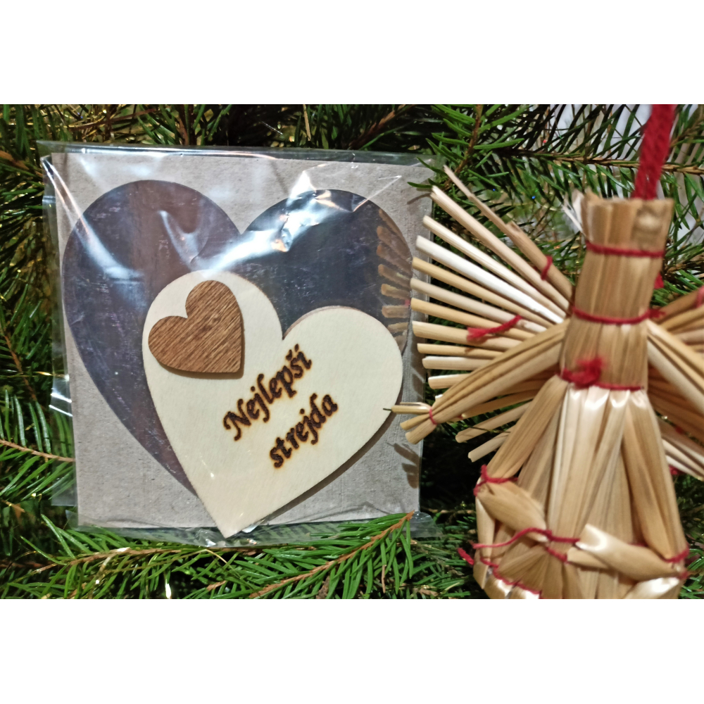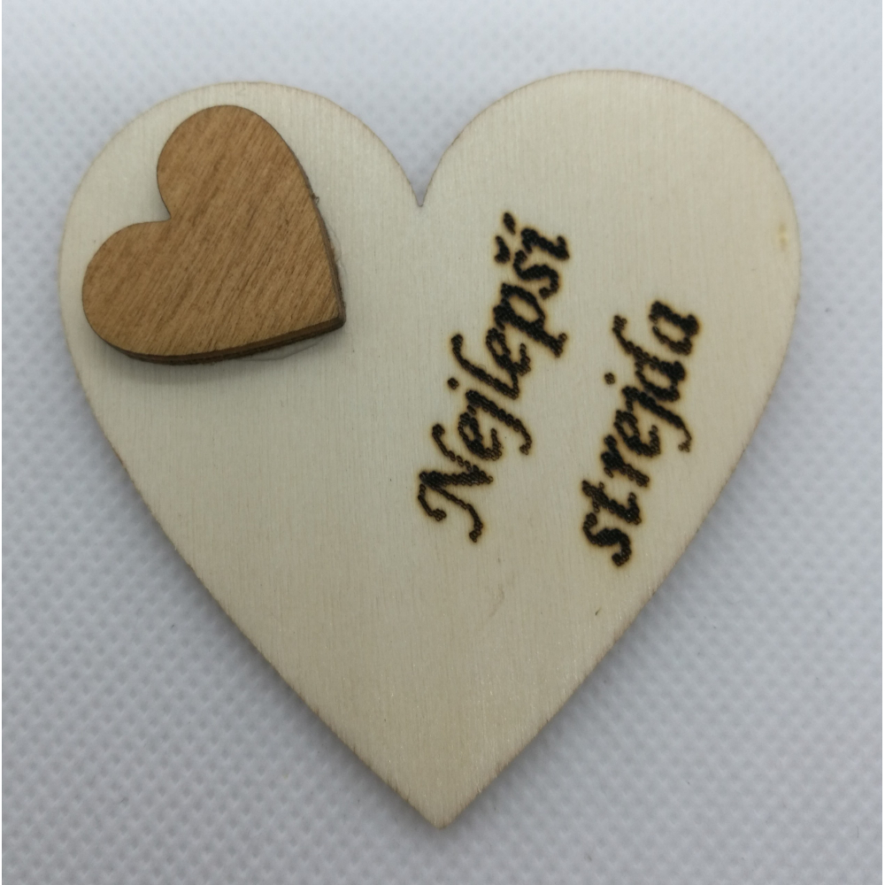 Srdce s věnováním z dřevěné překližky, 6x6 cm, vzadu s magnetem, dozdobeno srdcem širokém 2 cm. Text gravírován laserem. Umístění textu se může velmi mírně lišit, poloha srdce je nastavována ručně. Pokud není skladem, je možno do tří dnů vyrobit. Pro vlastní text přejděte v horním menu na Váš vlastní design.
