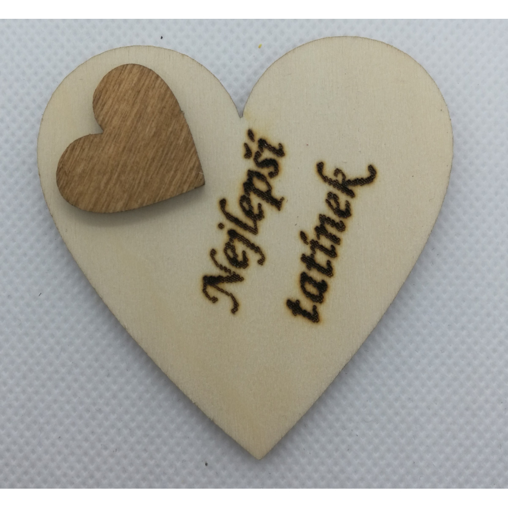 Srdce s věnováním z dřevěné překližky, 6x6 cm, vzadu s magnetem, dozdobeno srdcem širokém 2 cm. Text gravírován laserem. Umístění textu se může velmi mírně lišit, poloha srdce je nastavována ručně. Pokud není skladem, je možno do tří dnů vyrobit. Pro vlastní text přejděte v horním menu na Váš vlastní design.