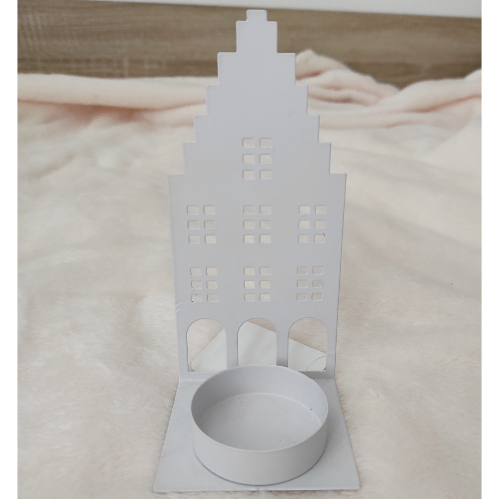 Kovový svícen na čajovou svíčku ve tvaru domečku.
