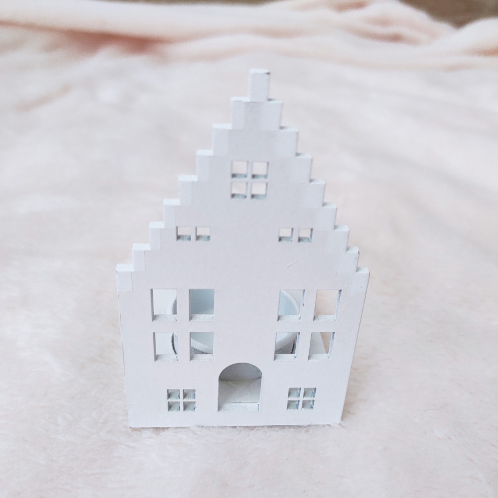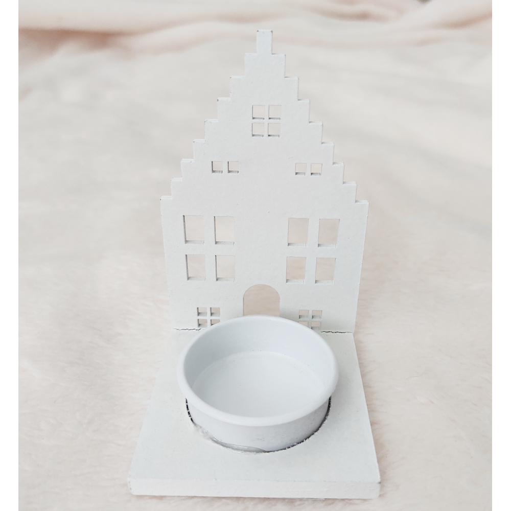 Dřevěný svícen na čajovou svíčku ve tvaru domečku.