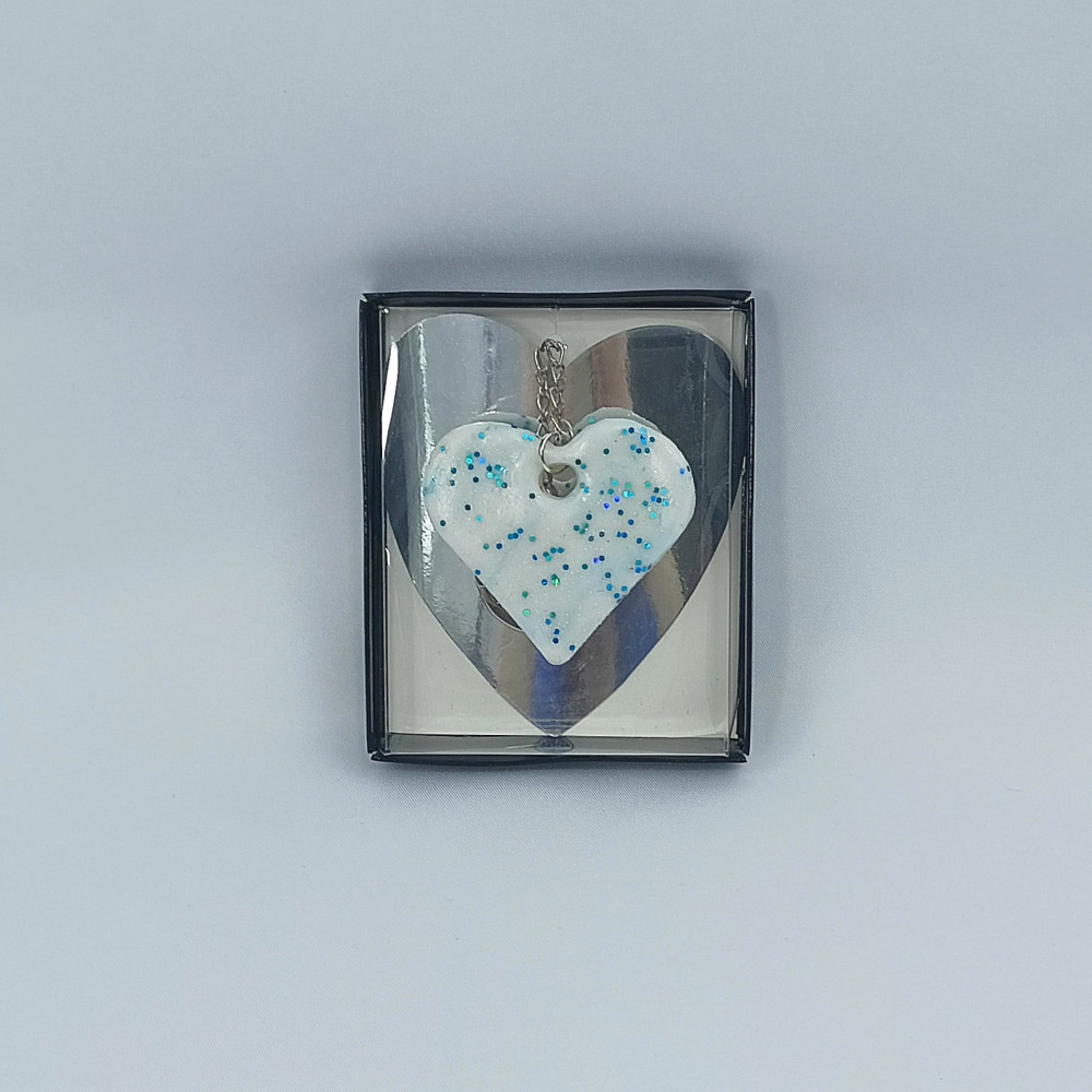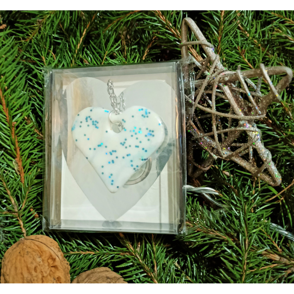 Přívěšek má tvar srdce, symbolu lásky a přátelství, který v sobě nese mnoho významů. Jeho bílá barva dodává čistotu a jednoduchost, zatímco modrá třpytka, která je do něj zasazena, přináší dojem kouzelného nočního nebe plného hvězd. Tento kontrast mezi bílou a modrou vytváří nejen krásný vizuální efekt, ale také přináší dojem klidu a harmonie.