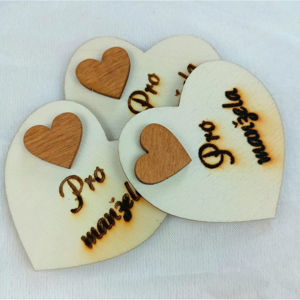 Srdce s věnováním z dřevěné překližky, vzadu s magnetem, dozdobeno srdcem širokém 2 cm. Text gravírován laserem. Umístění textu se může velmi mírně lišit, poloha srdce je nastavována ručně. Pokud není skladem, je možno do tří dnů vyrobit. Pro vlastní text přejděte na hlavní straně v levém menu na ,,Navrhni si..."
