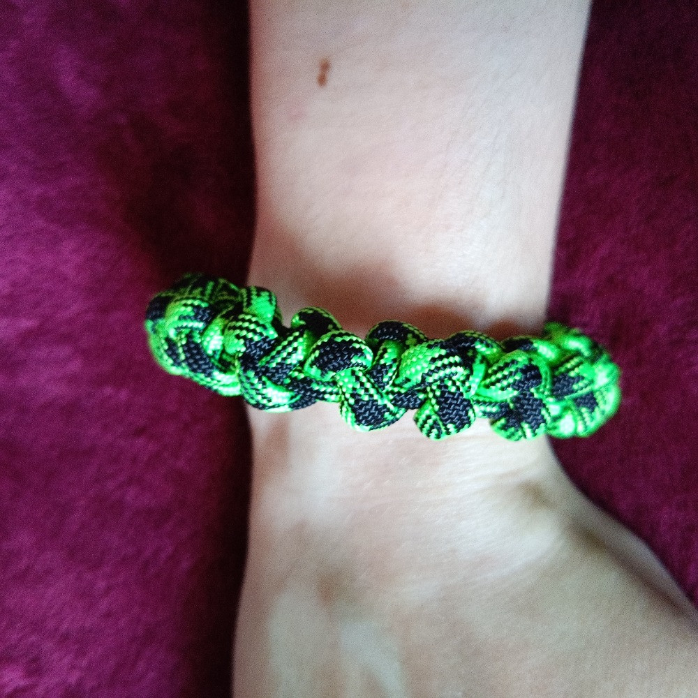 Stylový náramek z paracordu 550 se spirálovým vzorem v barvách Toxic Green. Lehký, extrémně pevný a ručně pletený doplněk pro všechny milovníky outdooru a originálního stylu. Inspirováno divočinou Apalačské stezky. Obvod 17 cm.