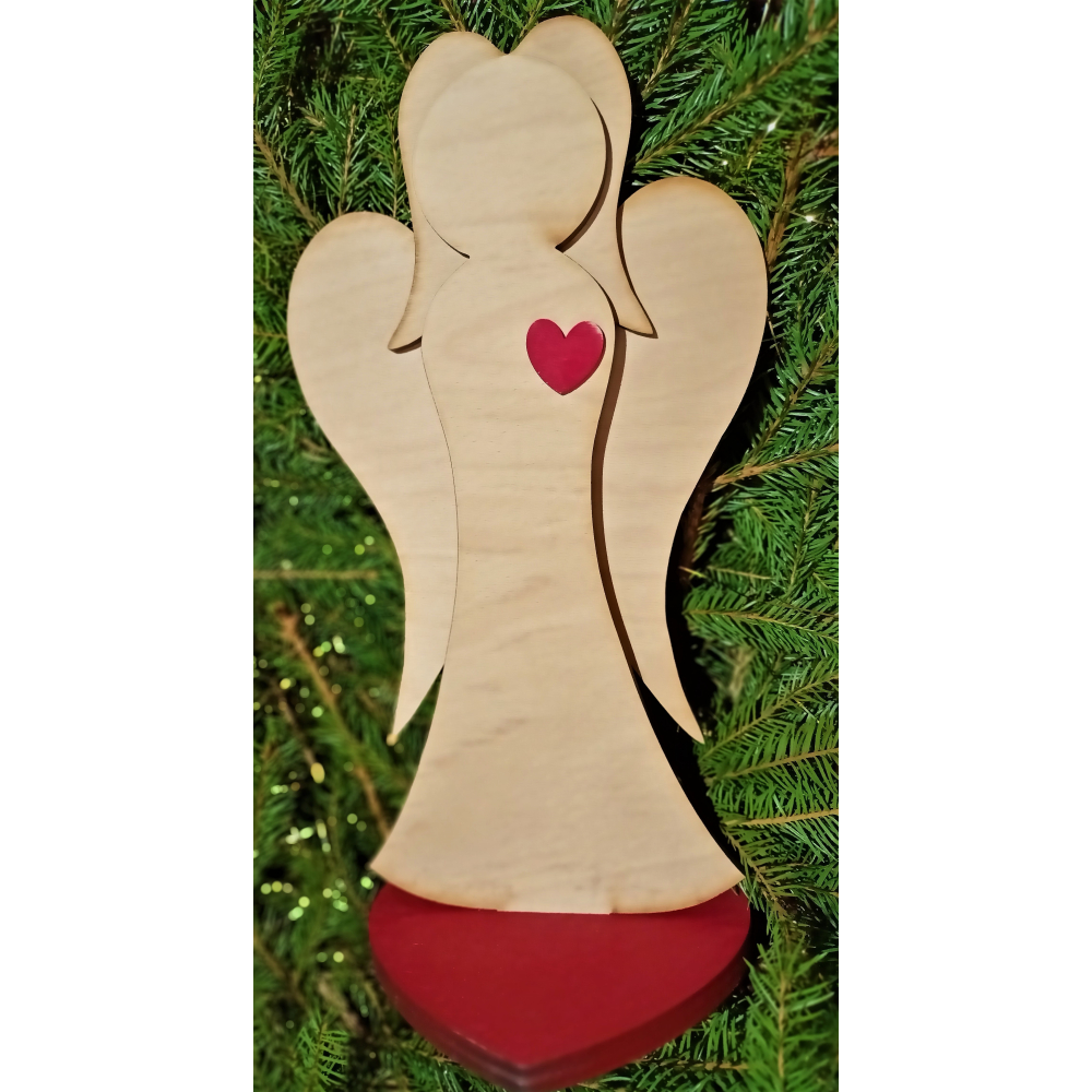 Anděl je ozdobený dřevěným srdíčkem ft na hrudi a posazený ve větším dřevěném srdíčku. Originální produkt, vyroben ručně v ČR. Barva: přírodní, srdce a držák jsou červené Dřevo: dub Rozměry: 29 cm x 16 cm