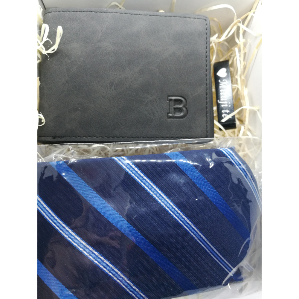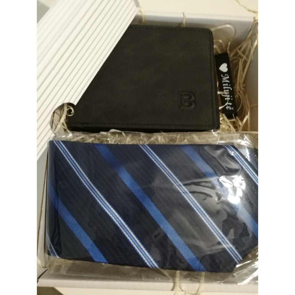 Dárková sada uložena v dárková bílé krabičce s průhledem o rozměrech 190x145x50 mm. Sada obsahuje kovovou klíčenku (otvírák) s věnováním, peněženku a kravatu.