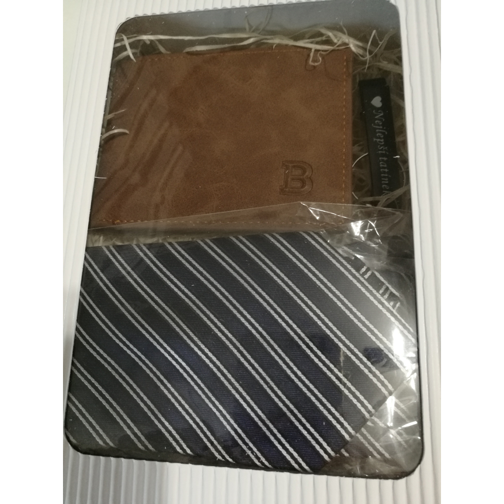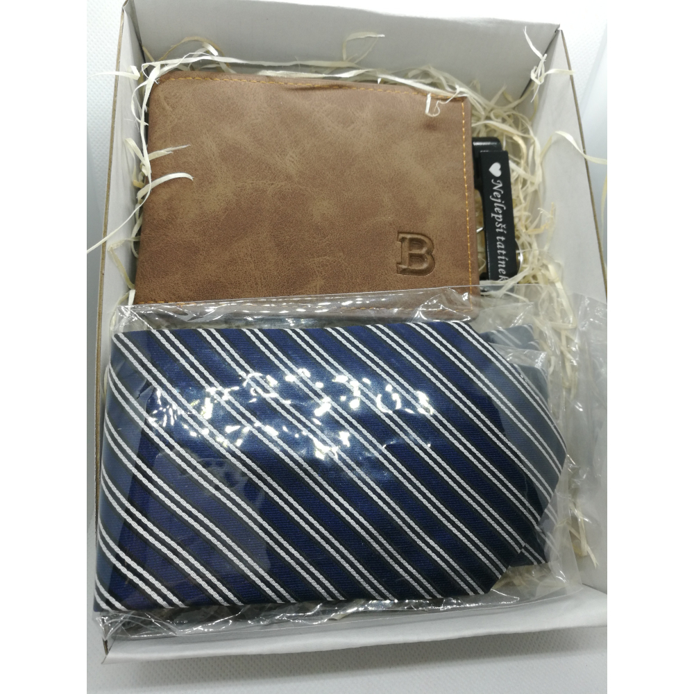 Dárková sada uložena v dárková bílé krabičce s průhledem o rozměrech 190x145x50 mm. Sada obsahuje kovovou klíčenku (otvírák) s věnováním, peněženku a kravatu.