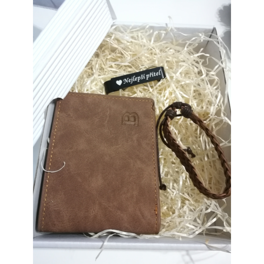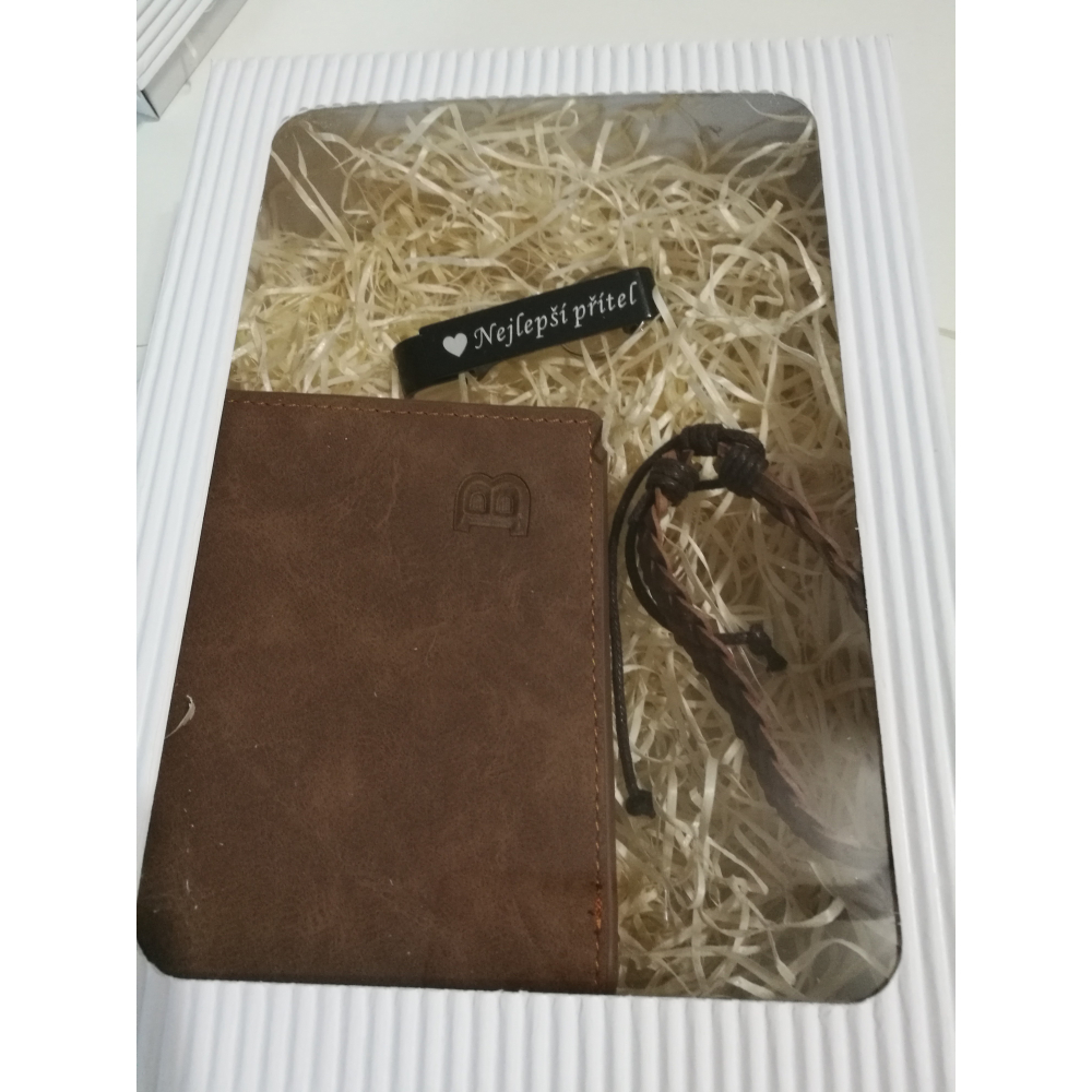 Uvnitř luxusní bílé krabičky s průhledem se ukrývá trio nezbytných doplňků pro každého muže: peněženka, náramek a klíčenka s otvírákem a věnováním, které z nich činí osobní a jedinečné dárky. Každý prvek této sady byl vybrán s myšlenkou na funkčnost, design a osobní vazbu.