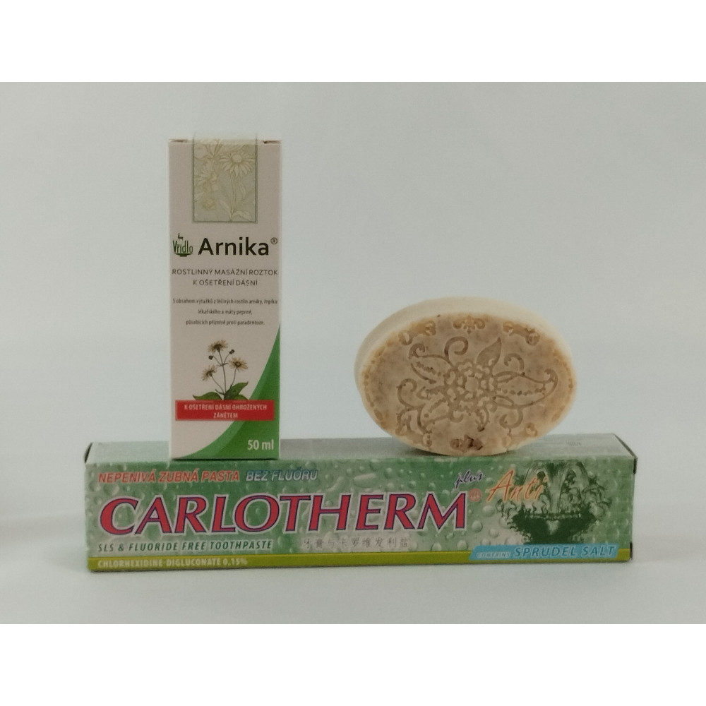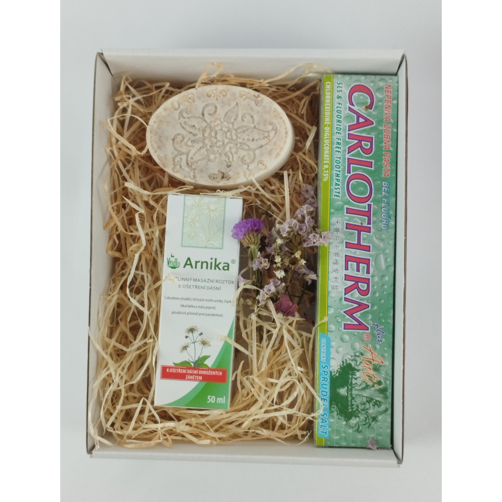 Dárková sada s péčí o pleť a dutinu ústní. Sada obsahuje přírodní, ručně vyráběné mýdlo s ovesnými vločkami. Toto mýdlo se výborně hodí pro citlivou pleť, kterou při mytí zároveň vyživuje. Součástí dárkové sady je dále nepěnivá zubní pasta s unikátním složením s vysokým podílem minerálů z přírodních minerálních solí a rostlinný masážní roztok k ošetření dásní s vynikajícím účinkem v boji proti zánětu dásní, paradentóze, nebo v případě infekce v ústech a při vzniku aftu.