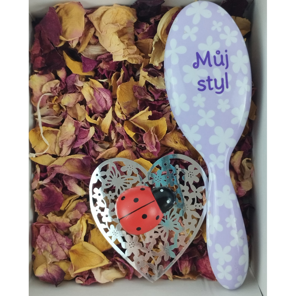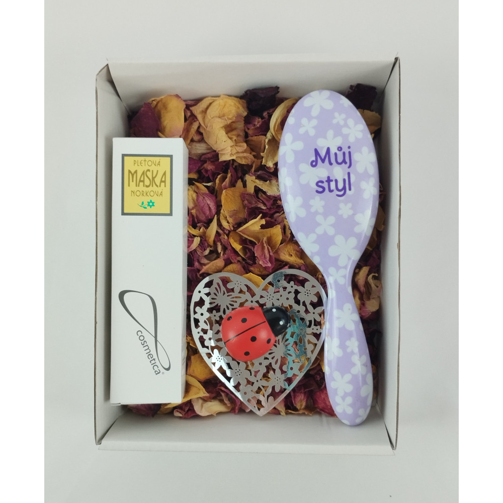 V dárkové sadě Můj styl je kromě kartáče na vlasy a norkové pleťové masky také na dekorativním srdíčku dřevěná beruška s magnetkem. Dárkové krabička je naplněná sušenými okvětními lístky růží, které kromě dekorativního prvku mohou být vhodnou koupelovou přísadou při relaxaci, ideálně v kombinaci s pár kapkami přírodního vonného oleje. Nechte své milé stylově hýčkat s dárkovou sadou Můj Styl.
