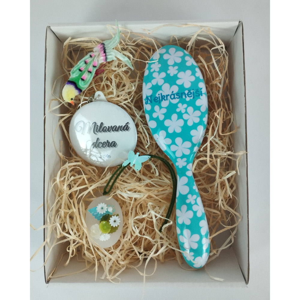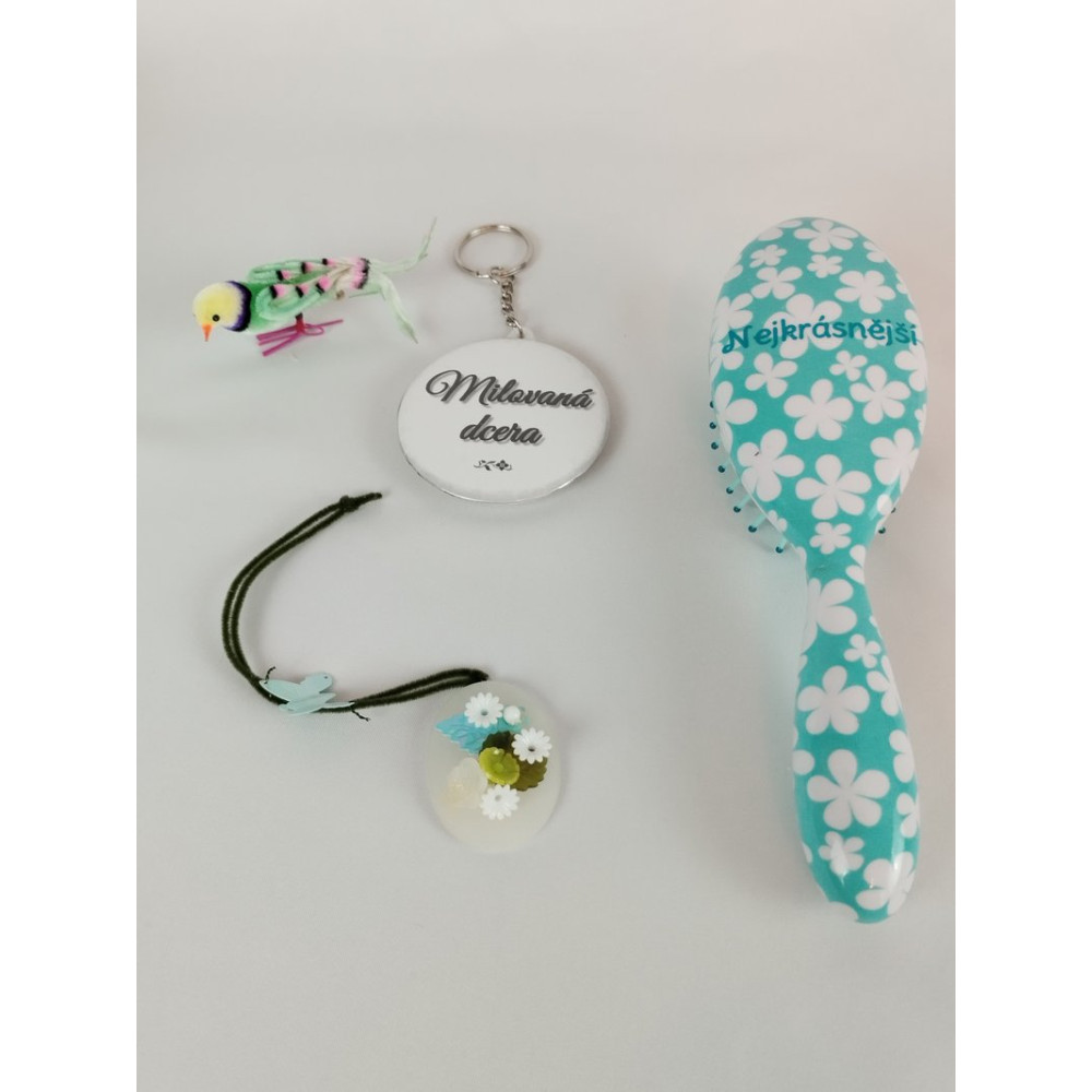 Dárková sada Milovaná dcera obsahuje kartáč na vlasy s nápisem Nejkrásnější, barevného dekorativního ptáčka, který se svou nožičkou dokáže zachytit na nejrůznějších místech v interiéru, přívěšek na klíče milovaná dcera a závěsnou ozdobu, kterou každá kreativní dívka s radostí upotřebí.