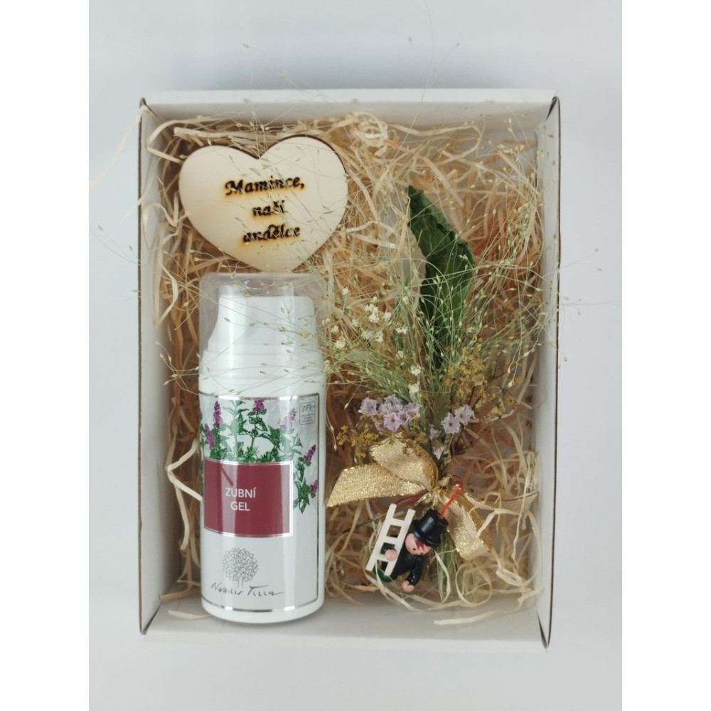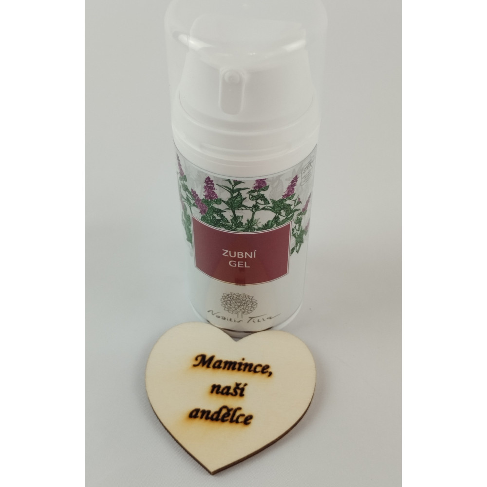 Dárková sada Mamince naší andělce jejíž součástí je Zubní gel s ultra jemným francouzským jílem pro zuby i dásně. Nepěnivý a neslazený čistící gel výtečně, a přitom šetrně čistí zubní sklovinu, působí antimikrobiálně a vhodně masíruje dásně, dále gravírované srdíčko, sušenou kytičku a kominíčka pro štěstí.