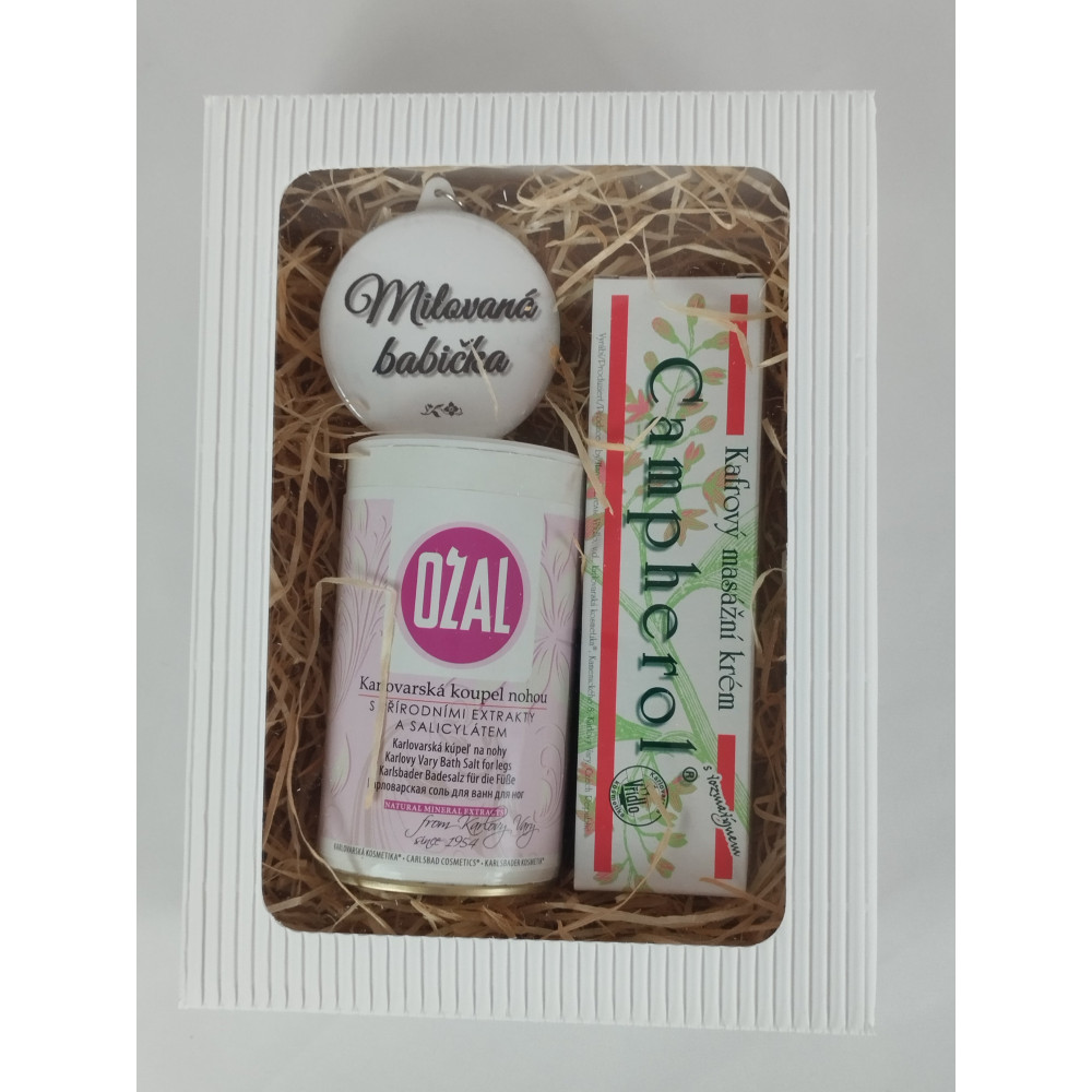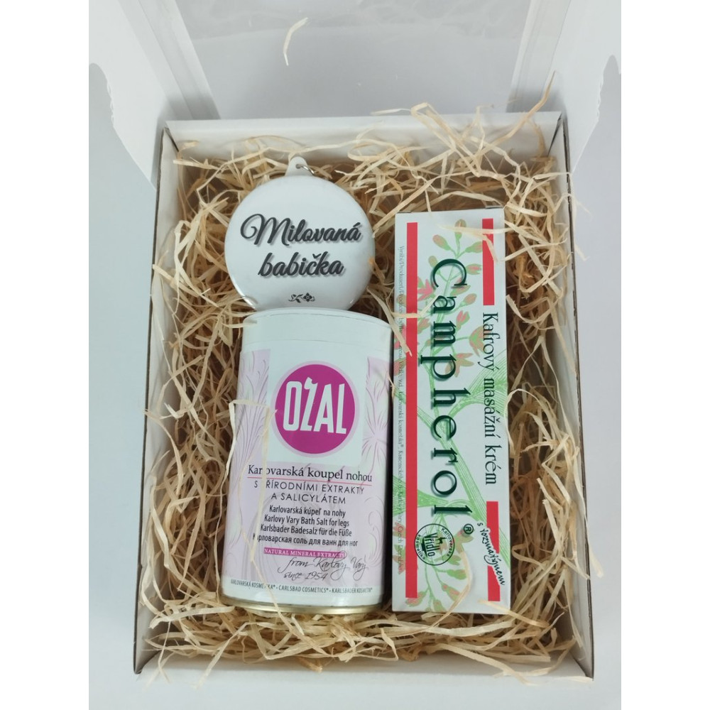 Dárková sada Milovaná babička obsahuje oblíbenou tradiční směs koupelové soli a vybraných rostlin v podobě velmi dobře rozpustného prášku. Koupel regeneruje a povzbuzuje proces výměny látek v těle. Směs výtažků z bylinek má osvěžující a antiseptický účinek a dále kafrový masážní krém, obsahující v bohaté dávce přírodní kafr a rozmarýn. Zvyšuje prokrvení unavených svalů na těle i nohou. Urychluje výměnu a čilejší proudění krve a tím podporuje výživu tkáně. Součástí dárkového balení je i přívěšek na klíče Milovaná babička.