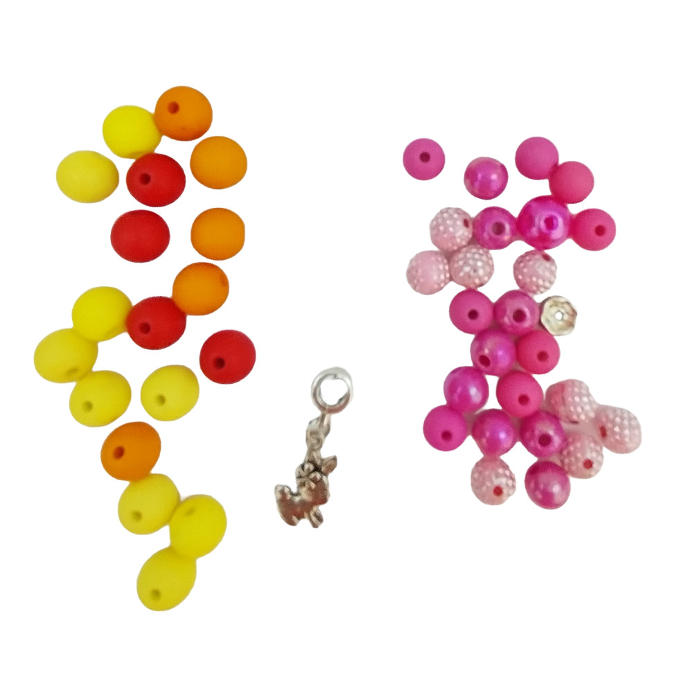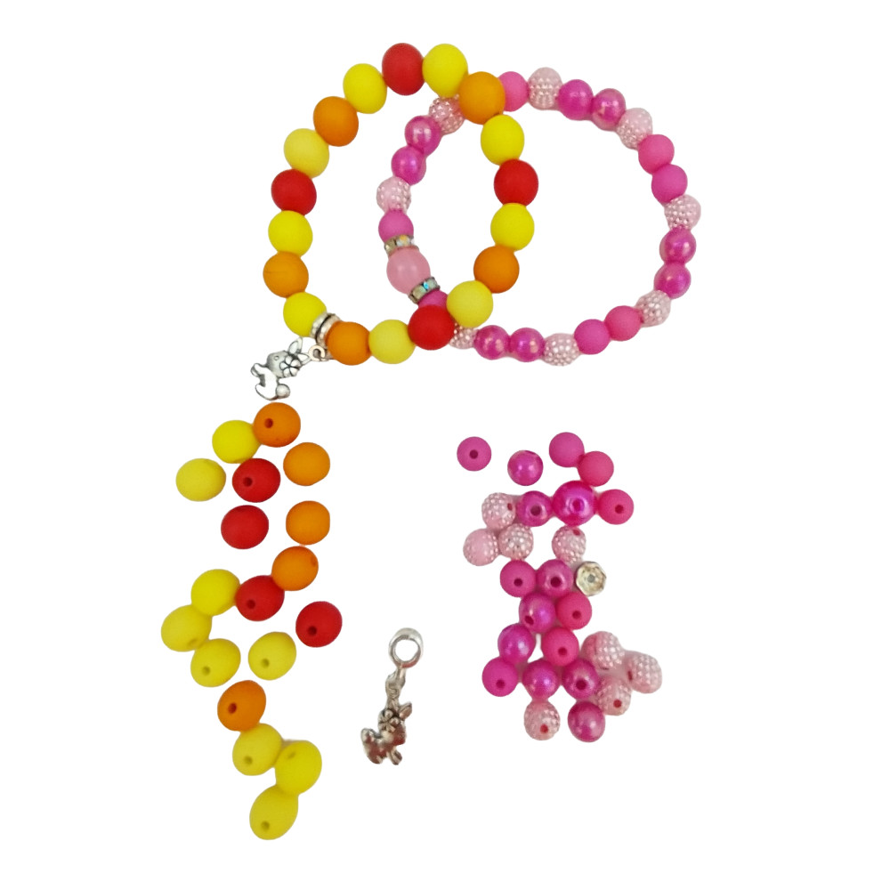 Tvořivá sada korálkových náramků v hravých barvách žluté, červené a odstínech růžové a fialové.