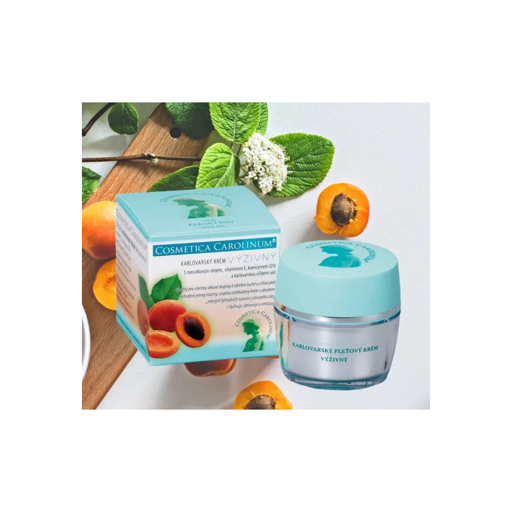 Karlovarský krém výživný s meruňkovým olejem, vitamínem E, koenzymem Q10 a karlovarskou vřídelní solí. Vhodný pro všechny věkové skupiny k ošetření suché a citlivé pleti. Hedvábně jemný, mastný, snadno vstřebatelný krém s obsahem „zelených“ přírodních surovin z olivového oleje.