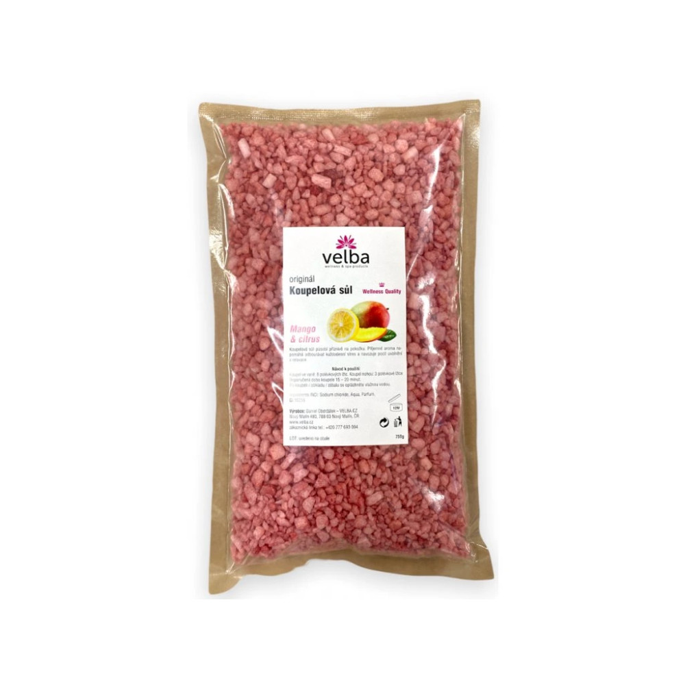 Velba Wellness koupelová sůl působí příznivě na pokožku. Příjemné aroma manga a citrusu napomáhá odbourávat stres a navozuje pocit uvolnění a relaxace. Výrobek neobsahuje parabeny.