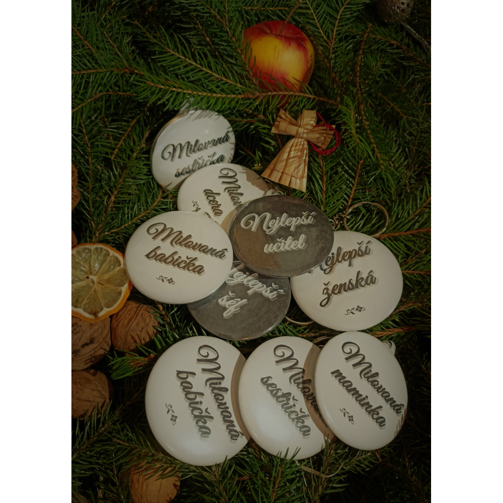 Přívěšek na klíče handmade s nápisem; placka o průměru 58 mm