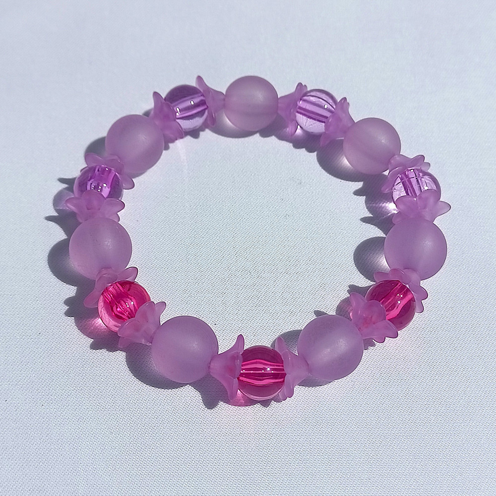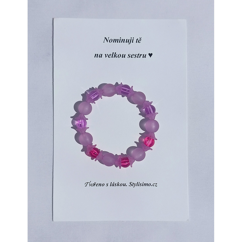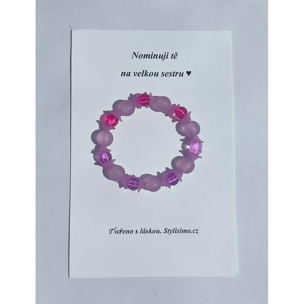 Náramek z korálků Pro radost. Korálky jsou navlečeny na pružince a celý náramek je přišitý k dárkové kartě.